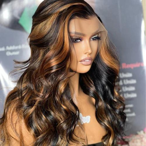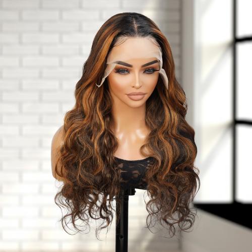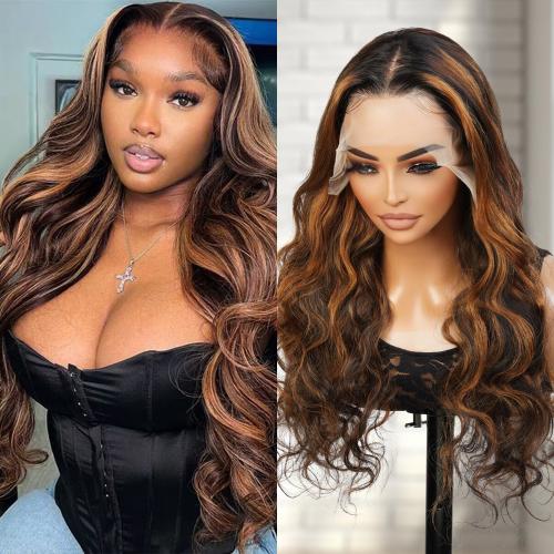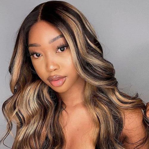 UpScale 100% Human Hair Glueless Pre Plucked 13x4 Lace Frontal Wig Honey Blonde Chunky Highlight Body Wave 24"