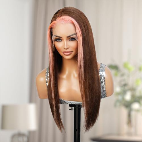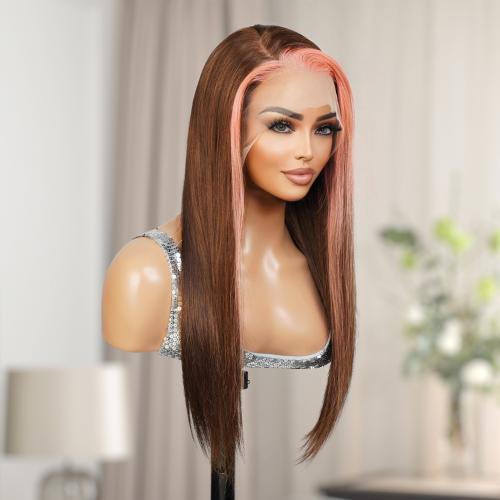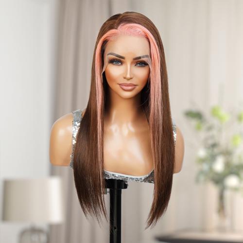 UpScale 100% Human Hair Glueless Pre Plucked 13x6 Lace Frontal Wig Pink Brown Highlight Straight 20"