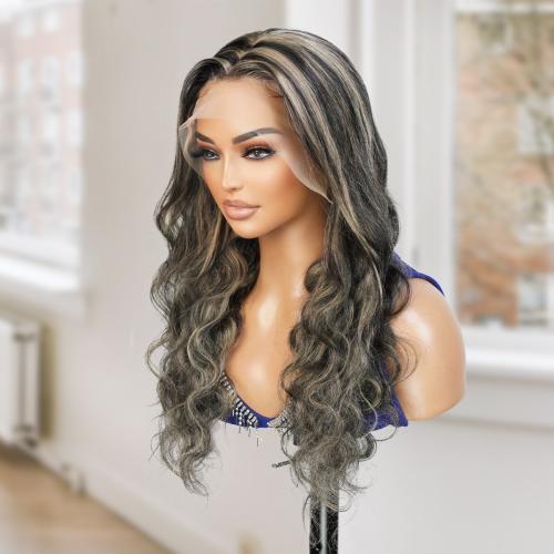 UpScale 100% Human Hair Glueless Pre Plucked 13x4 Lace Frontal Wig Silver Gray Highlight Body Wave 24"